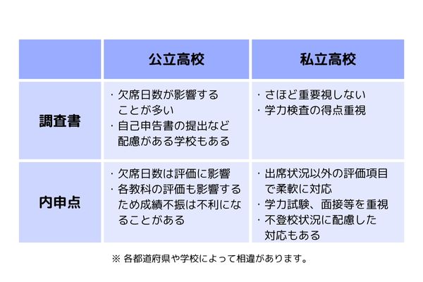 調査書には欠席日数が明記される場合が一般的で、公立高校の募集要項・実施要項には、欠席日数が多い場合に「審議の対象とする」と明記されている高校が多く、入試で不利になることがあるとされてきました。