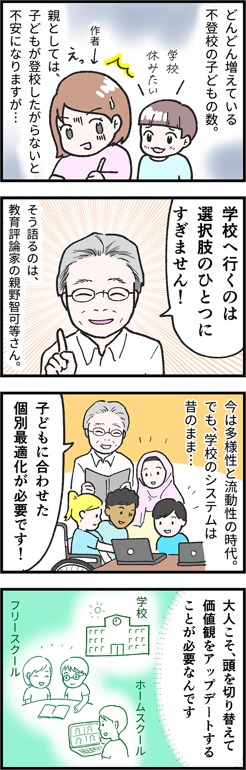 今回のテーマは「もし子どもに『学校に行きたくない』と言われたら、保護者はどうするべきか?」。元小学校教師で教育評論家の親野 智可等(おやのちから)さんによるセミナーをもとに、エッセイ漫画でご紹介します。