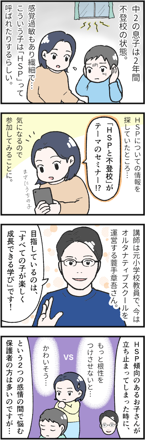 その道の専門家をゲスト講師に迎えて開催している「不登校ライフナビ」オンラインセミナーは、不登校でお悩みの保護者に向けて、ヒントになるようなさまざまなテーマを取り上げています。そうしたセミナーをマンガでふり返るのが「マンガでセミナーダイジェスト」。