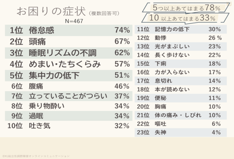 KJ起立性調節障害オンラインコミュニケーションが2022年に実施したアンケート(起立性調節障害オンライン講演会の申込者490人)では、起立性調節障害のかたのお困りの症状の上位は、倦怠感、頭痛、睡眠リズムの不調、めまい・立ちくらみ、集中力の低下で、どれも半数以上の方が当てはまるという結果になりました。
