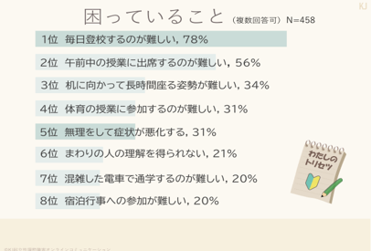 さらに、5項目以上の症状を回答した方が約8割、10項目以上が約3割で、おひとりのかたに複数の別々の症状が表れ、しかも、全て外見からわからない特徴があるといえます。また、起立性調節障害で困っていることの1位は「毎日登校するのが難しい」、2位が「午前中の授業に出席するのが難しい」となっており、3位の「机に向かって長時間座る姿勢が難しい」のように、椅子に座ることさえ難しい子どもも多くいることに驚かれるのではと思います。