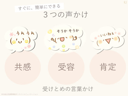 この3つは、何でもない言葉のようですが、共感・受容・肯定を表しています。子どもがつらい気持ちのときには寄り添い、何か行動を起こそうとしたときには新しい一歩への活力になる言葉です。