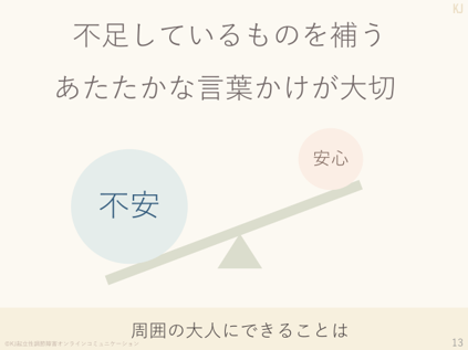 ぜひご家庭では、子どもの内面に思いを巡らせ、「不安」や「心配」が多いだろうから、「安心」や「リラックス」を補う声かけを実践できるとよいでしょう。