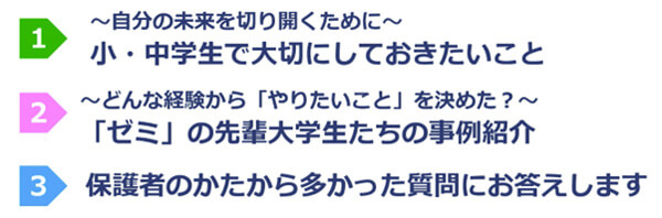 小学生保護者向けセミナー「先輩大学生たちの事例を紹介 将来やりたいことを見つける力」一部ご紹介